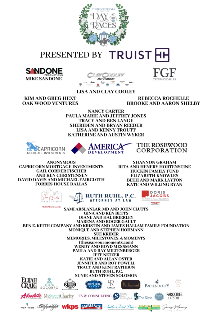 Celebrate the spirit of the Kentucky Derby at Turtle Creek Conservancy’s signature spring fundraiser, Day at the Races. This annual tradition brings together friends and supporters for an afternoon of elegance, excitement, and philanthropy in support of Turtle Creek Park and Arlington Hall.